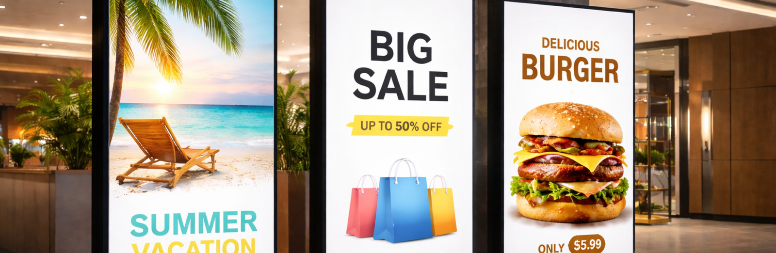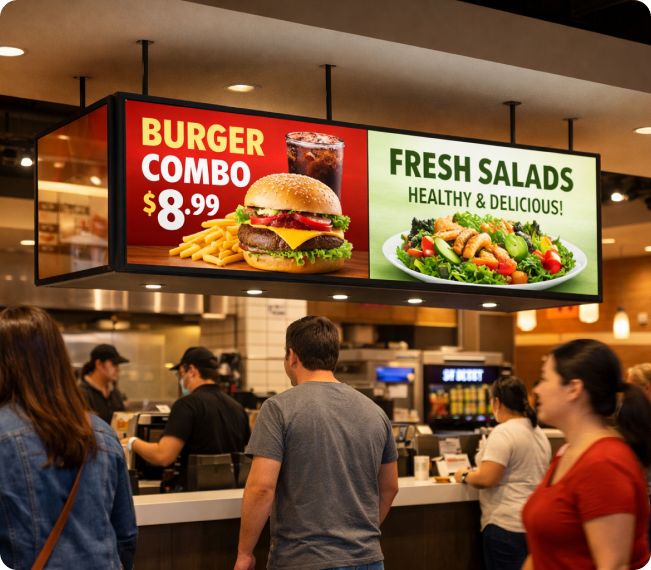 Digital LED lightboxes are designed to deliver maximum visibility in high-traffic indoor commercial environments. Their bright illumination, clear visuals, and modern presentation make them ideal for spaces where businesses need to capture attention quickly.